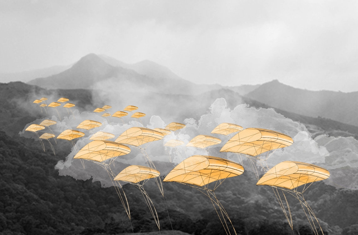 CLOUD MAGNET proposes a series of kites distributed along various site zones within the Guanacaste-Tilarán mountain range. Two types of kites are designed: a cloud-forming [CF] kite and a cloud-attracting [CA] kite, which work through the creation of low pressure zones and the reduction of air temperature, essential environmental conditions for the formation of clouds. Both kites utilize bio-PCM coated fabric to reduce the temperature of the surrounding air. Bio-PCM is a phase change material that stores high quantities of latent heat through the passive change of states of biodegradable fats and oils. The bio-PCM is microencapsulated and printed onto cuben fiber, an ultra-lightweight nonwoven fabric commonly used for sails. The CF kite channels air through a bundle of venturi tubes based on Bernoulli’s Principle of Pressure, which creates low- pressure zones within a narrow throat, dispersing puffs of clouds at its tail. The CF kites are located in varying densities within the lower to mid altitude site zones. The airfoil form of the CA kite directs airflow around the kite, which creates a low-pressure zone on the top surface of the kite in order to mitigate the lifting effect of the clouds on the mountain. The CA kites are located in clusters at the highest altitudes of the forest.